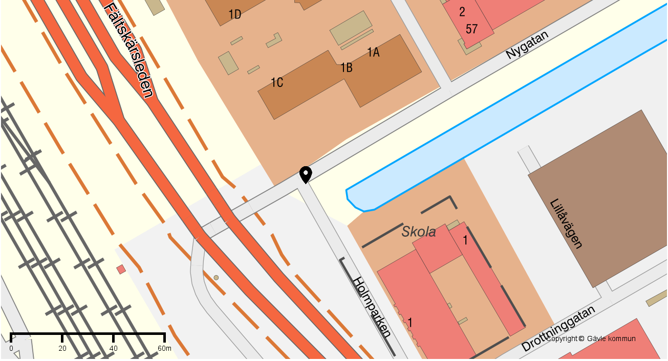 Jag går över nygatan där den fortsätter in till Öster varje dag. Det finns en bra trappa upp från gångvägen och en trottoar på andra sidan men inget övergångsställe! Här går barnfamiljer och äldra varje dag utan något skydd.